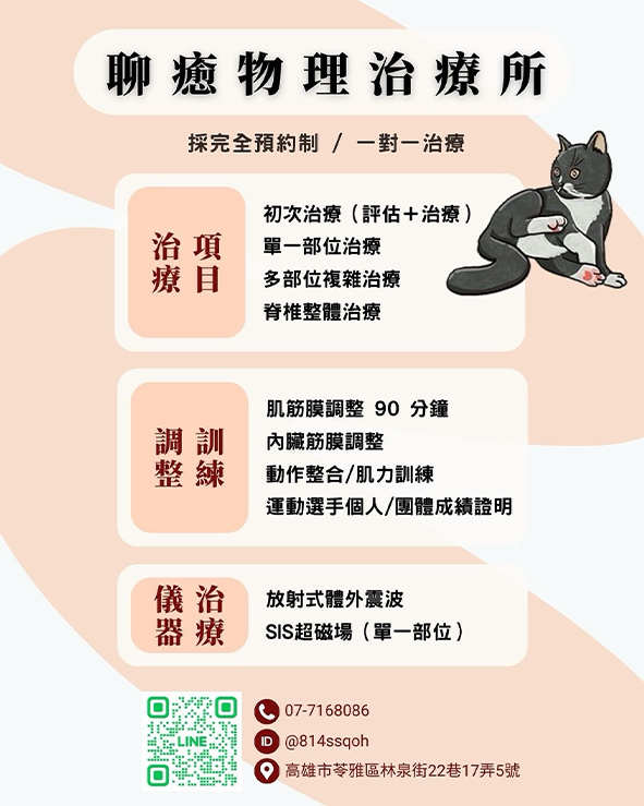 最特別的是,我們還有一位王牌治療師——貓咪店長「哈肉」。不論是需要骨盆調整、面對五十肩的困擾,還是想找個地方好好處理累積已久的舊傷,推薦聊癒物理治療所,我們隨時歡迎你來!
